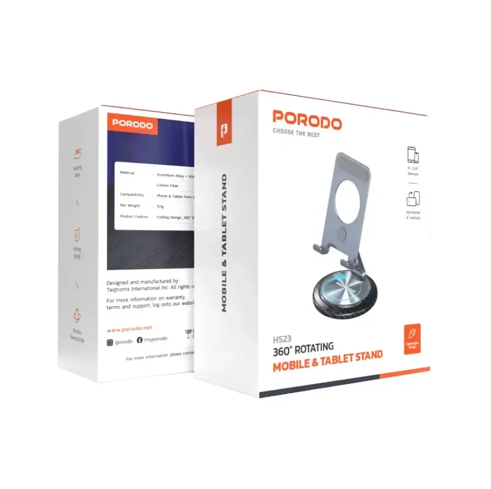 يعد حامل بورودو (Porodo) الدوار بزاوية 360 درجة للهواتف والأجهزة اللوحية الإكسسوار الأمثل للترفيه والراحة دون استخدام اليدين. صُنع هذا الحامل من مزيج فائق الجودة من سبائك الألومنيوم، ووسادة السيليكون، وخشب الجوز، مما يوفر المتانة مع لمسة نهائية أنيقة. وهو يدعم الهواتف والأجهزة اللوحية التي يتراوح حجمها من 5 إلى 12.9 بوصة، لذا فهو واسع بما يكفي لاستيعاب مجموعة متنوعة من الأجهزة. يتضمن الحامل قاعدة ثابتة ومضادة للانزلاق توفر الاستقرار لجهازك أثناء المشاهدة أو القراءة أو العمل. كما يساعد تصميمه القابل للطي في توفير أقصى درجات القابلية للنقل والمرونة للاستخدام أثناء التنقل أو التخزين في مكانه. ويساعد الدوران بزاوية 360 درجة في إمالة جهازك بسهولة نحو زاوية المشاهدة المفضلة لديك، سواء في الوضع الرأسي أو الأفقي. وسواء كنت تقوم بالطهي وفقاً لوصفة، أو تشاهد بث فيديو، أو تجري مكالمة فيديو، فإن حامل بورودو يوفر مشاهدة مريحة دون استخدام اليدين لكل احتياجاتك.