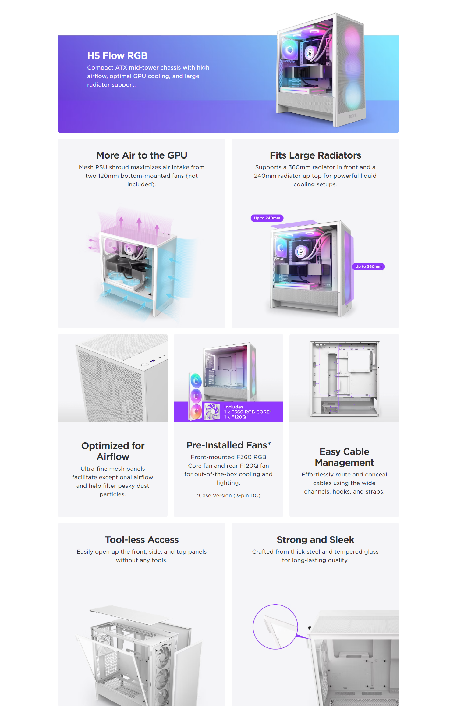 يعزز صندوق H5 Flow آر جي بي تدفق الهواء وتبريد وحدة معالجة الرسومات بفضل غطاء مزود الطاقة المثقب، والألواح الشبكية، ودعم المبردات الكبيرة – كل ذلك في تصميم مدمج من نوع ميد-تاور.