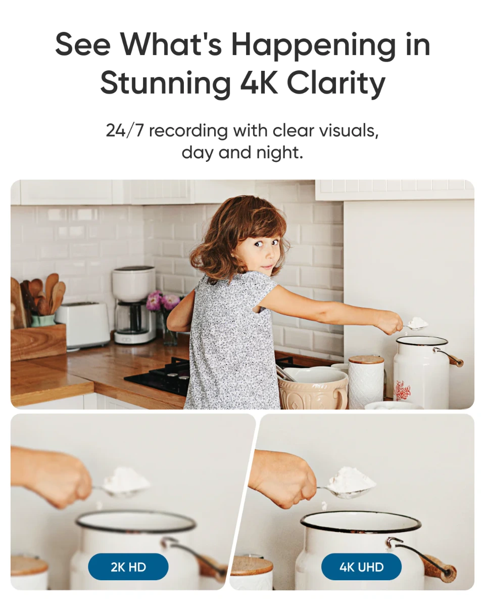 • تسجيل 4K فائق الوضوح على مدار الساعة: التقط كل التفاصيل، ليلاً ونهاراً، بتسجيل 4K فائق الوضوح. ابق على اتصال مع العائلة والحيوانات الأليفة باستخدام الصوت ثنائي الاتجاه المدمج للتواصل الفوري.