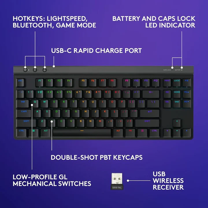 Logitech G515 LIGHTSPEED TKL delivers speed, accuracy, and customization with a sleek, low-profile, tenkeyless design. This wireless gaming keyboard features tri-mode connectivity, GL mechanical switches, double-shot PBT keycaps, sound dampening construction, and LIGHTSYNC RGB.