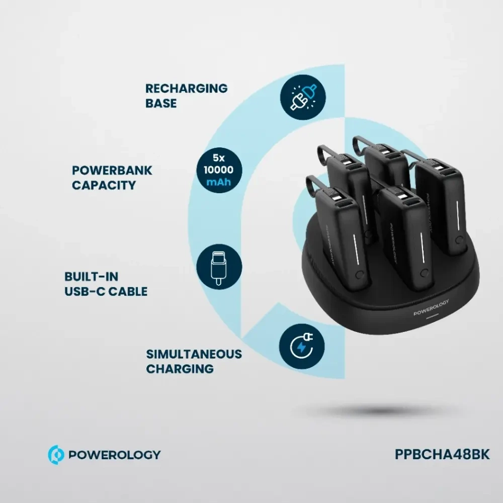 The Powerology × 5 10000mAh Power Bank Station is a versatile, high-performance charging solution for keeping multiple devices powered up simultaneously. It includes five 10000mAh power banks, each with a built-in Type-C cable that efficiently charges a number of devices. The following power bank comes with different output options, including USB-C, USB-A, and cable-Type C, all featuring fast charging: 20W PD, 18W, and SCP 22.5W for quick power delivery. In this model, the charging base is fitted with DC 12V/6A input for fast recharging, while the contact output is up to 60W across five 12W ports, making it ideal for taking care of a number of devices. Equipped with inbuilt overcharge, overheating, and short-circuit protection, this station uses high-density batteries for maximum efficiency. The Powerology × 5 Power Bank Station will be a reliable and efficient charging solution for all your devices, perfect for home, office, or on-the-go use.