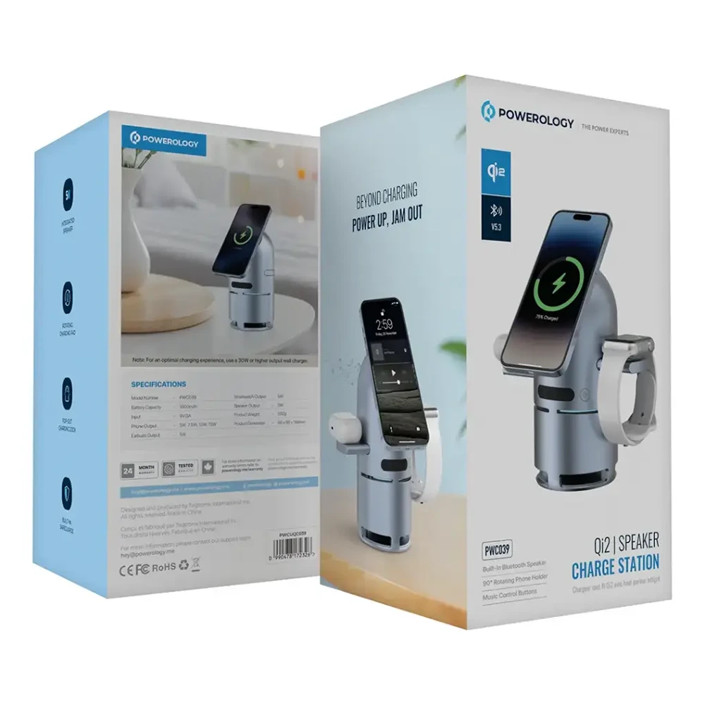 The Powerology Qi2 Speaker Charge Station is a revolutionary single-product device that charges your essentials and produces sound. It has a 1000mAh capacity and charges through a 9V/3A input, which supports quick wireless charging for a phone with outputs of 5W, 7.5W, 10W, and 15W. It charges earbuds and smartwatches at 5W each as well. The device features a rotating charging pad and pop-out charging dock with room for easy and flexible positioning of your devices. There is a 90° rotating phone stand with the optimal viewing angle while it charges. The V5.3 Bluetooth speaker produces crisp sound with handy music control buttons for easy management of sounds. Safety is provided through built-in protection from overcharging and overheating. The Powerology Qi2 offers fast charging, cross-device compatibility, and excellent audio, making it the perfect bedside or desktop companion for hectic lifestyles.