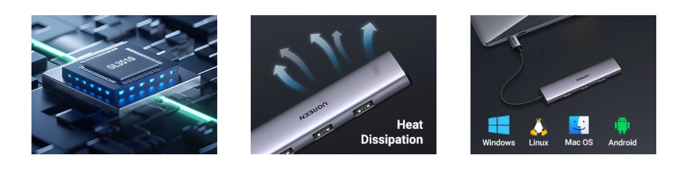 HUB from the Ugreen brand is not only a perfect accessory for every user. It is also a well-designed gadget with relatively small dimensions. Everything that is most important has been closed in a small but solid housing. The side part has all the necessary USB sockets. A 15-centimeter long cable will be perfect for laptops. However, desktop users will also not complain about it – it is long enough to safely connect it and set the HUB in a convenient position.
