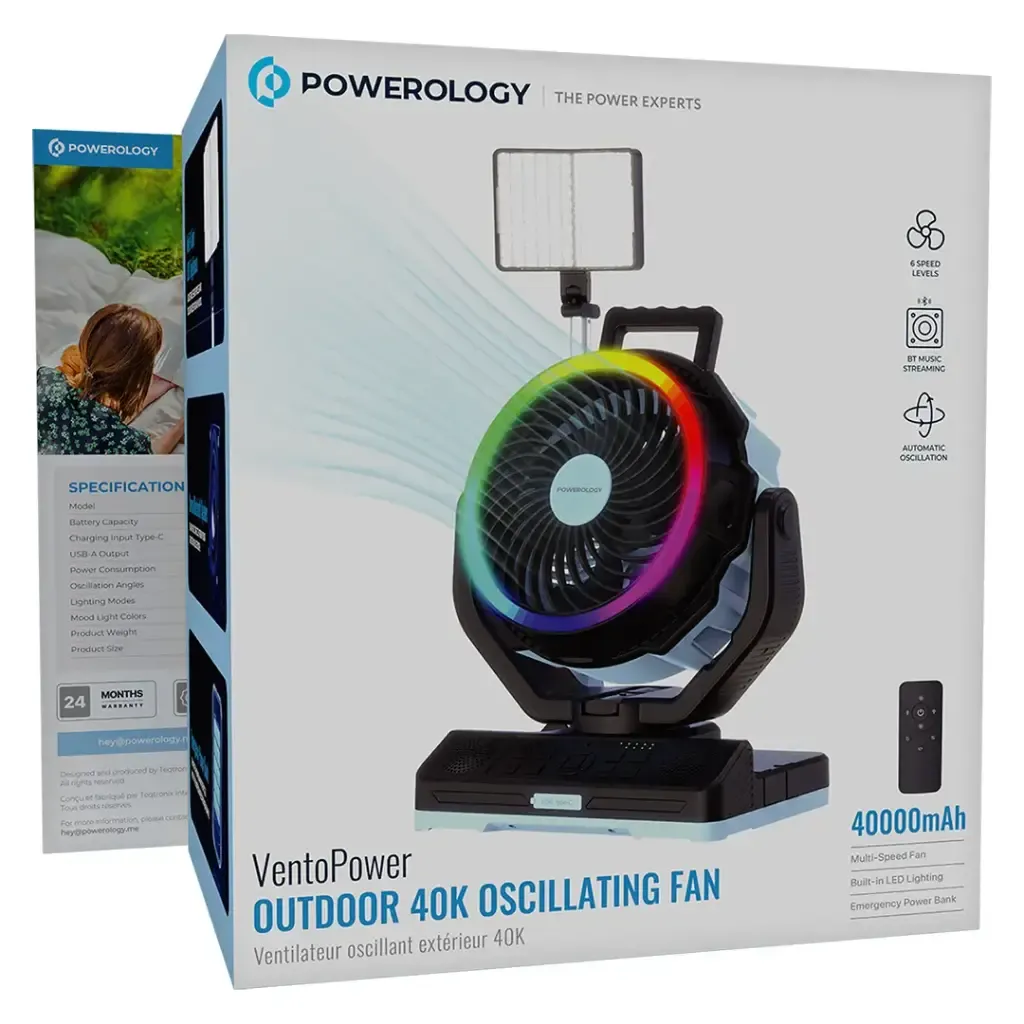 مروحة باورولوجي فينتوباور الخارجية 40K المتأرجحة هي الحل الأمثل والمتعدد الاستخدامات للتبريد والترفيه. بفضل البطارية الضخمة بسعة 40,000 مللي أمبير/ساعة، يمكنها تزويدك بساعات من تدفق الهواء القوي الشديد أو أن تكون بنك طاقة احتياطي لشحن أجهزتك في الأوقات الحرجة. تتيح لك ثلاث زوايا تأرجح (45°، 90°، 120°) وسرعات هواء متغيرة تحقيق أفضل توزيع للهواء سواء في الداخل أو في الهواء الطلق، بينما تسمح لك السماعة الستيريو المدمجة بتقنية البلوتوث وتشغيل بطاقة TF بالاستمتاع بموسيقاك المفضلة مع نسيم الهواء. ستحدد إضاءة الأجواء، مع 7 ألوان متغيرة و3 مستويات سطوع (أبيض، أصفر، دافئ)، النبرة المحيطة بك. تم تصميم فينتوباور بمستوى عالٍ من التكيف وتتضمن مؤقتًا، ومنافذ USB-A وType-C للشحن السريع، وقدرة 45 واط. باختصار، إنها الشريك المثالي للاستخدام في التخييم أو الفناء أو المنزل.