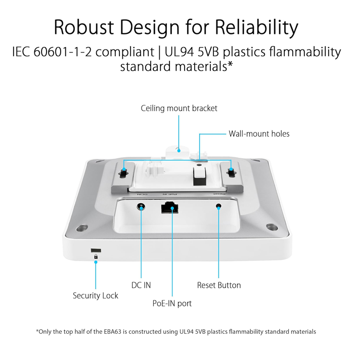 The ExpertWiFi EBA63 is built for safety and reliability, complying with IEC60601-1-2 standards, and its top half is made of materials that meet the UL94 5VB plastics flammability standard* to ensure a stable and dependable connection.