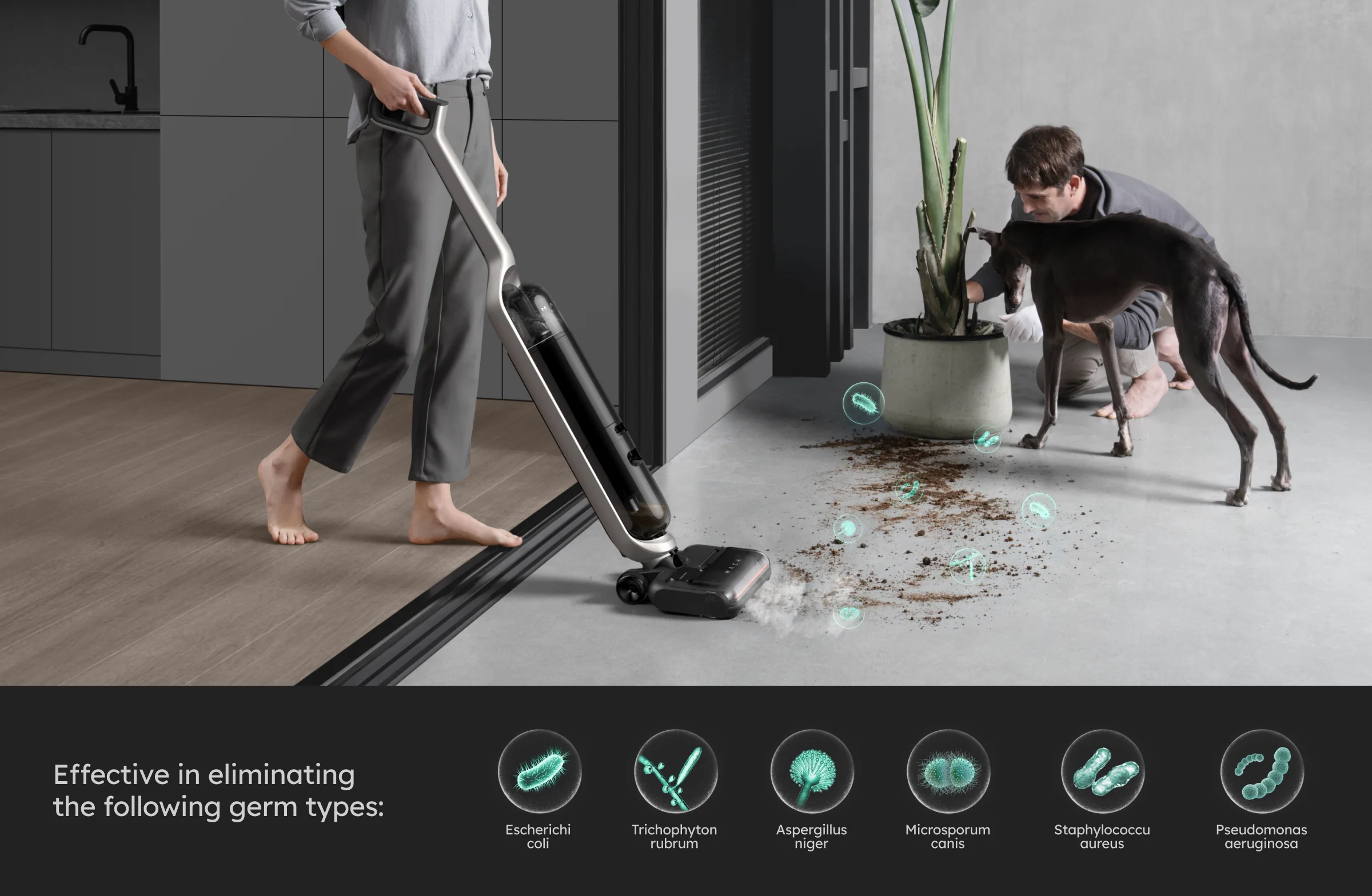 • Triple Self-Cleaning System: Post cleaning, select self-cleaning mode to wash the mop with cleaning fluid; while ozone minimizes odor and germs. Hot air is then circulated to ensure the device is 100% dry.