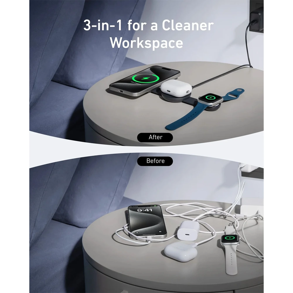 Keep your workspace uncluttered with a 3-in-1 wireless charger that powers multiple devices simultaneously.
