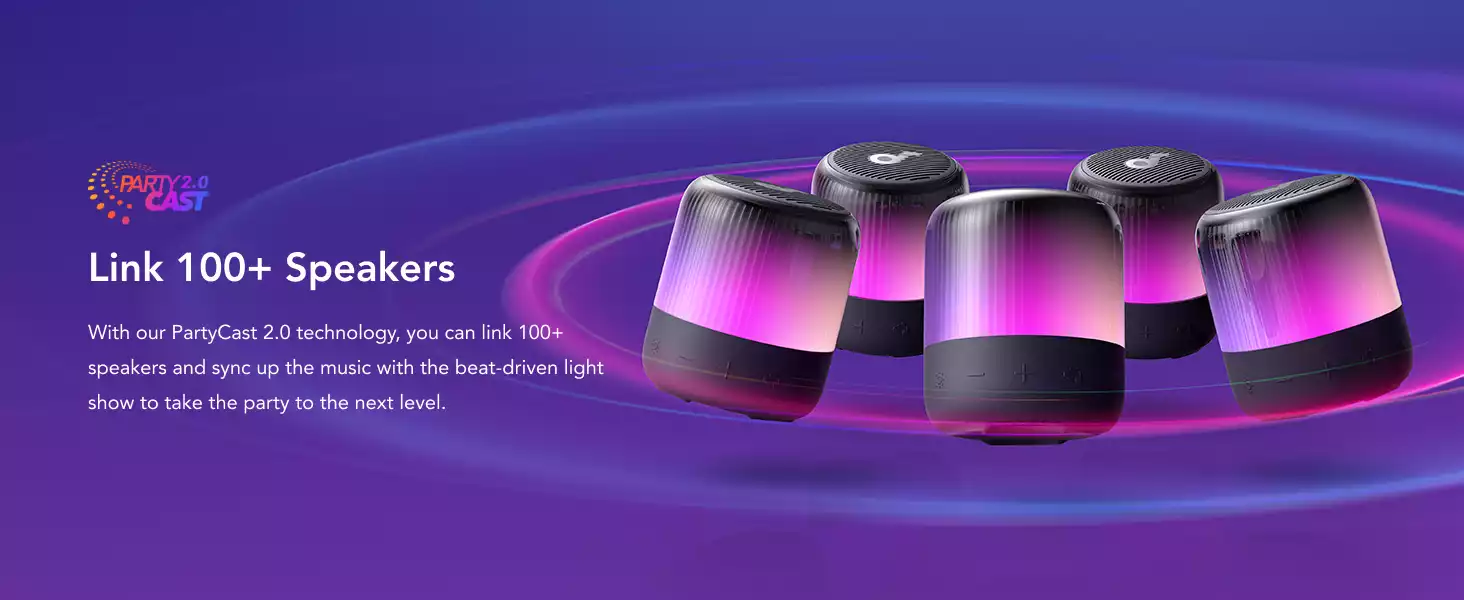 • PartyCast 2.0: Simultaneously connect 100+ speakers with synchronized sound and lighting to really feel the party atmosphere.