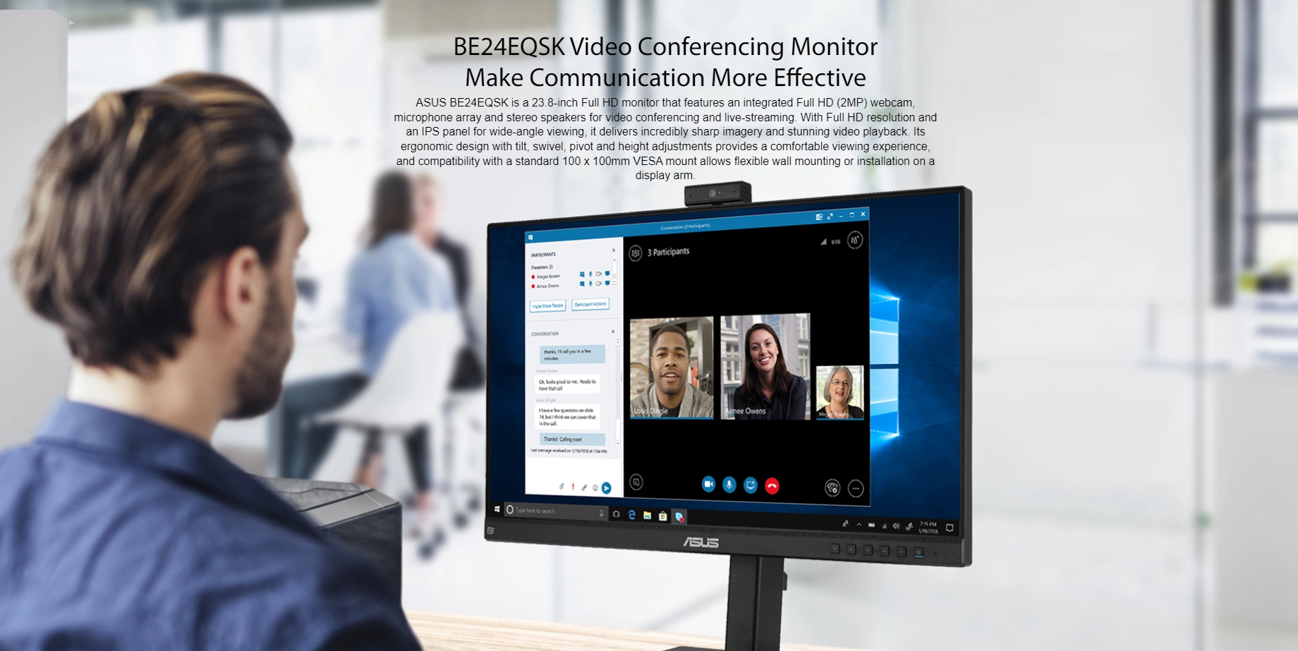 ASUS BE24EQSK is a 23.8-inch Full HD monitor that features an integrated Full HD (2MP) webcam, microphone array and stereo speakers for video conferencing and live-streaming. With Full HD resolution and an IPS panel for wide-angle viewing, it delivers incredibly sharp imagery and stunning video playback. Its ergonomic design with tilt, swivel, pivot and height adjustments provides a comfortable viewing experience, and compatibility with a standard 100 x 100mm VESA mount allows flexible wall mounting or installation on a display arm.