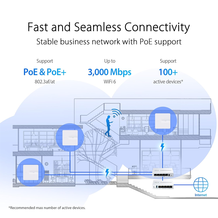 The ASUS ExpertWiFi EBA63 provides seamless connectivity for various business settings, featuring the flexible power options of PoE (Power over Ethernet) and AC adapters. By connecting to a PoE switch or PoE wired router, you can get both power and data transmission over a single Ethernet cable.