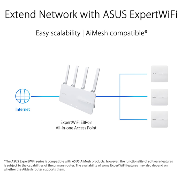 *The ASUS ExpertWiFi series is compatible with ASUS AiMesh products; however, the functionality of software features is subject to the capabilities of the primary router. The availability of some ExpertWiFi features may also depend on whether the AiMesh router supports them.