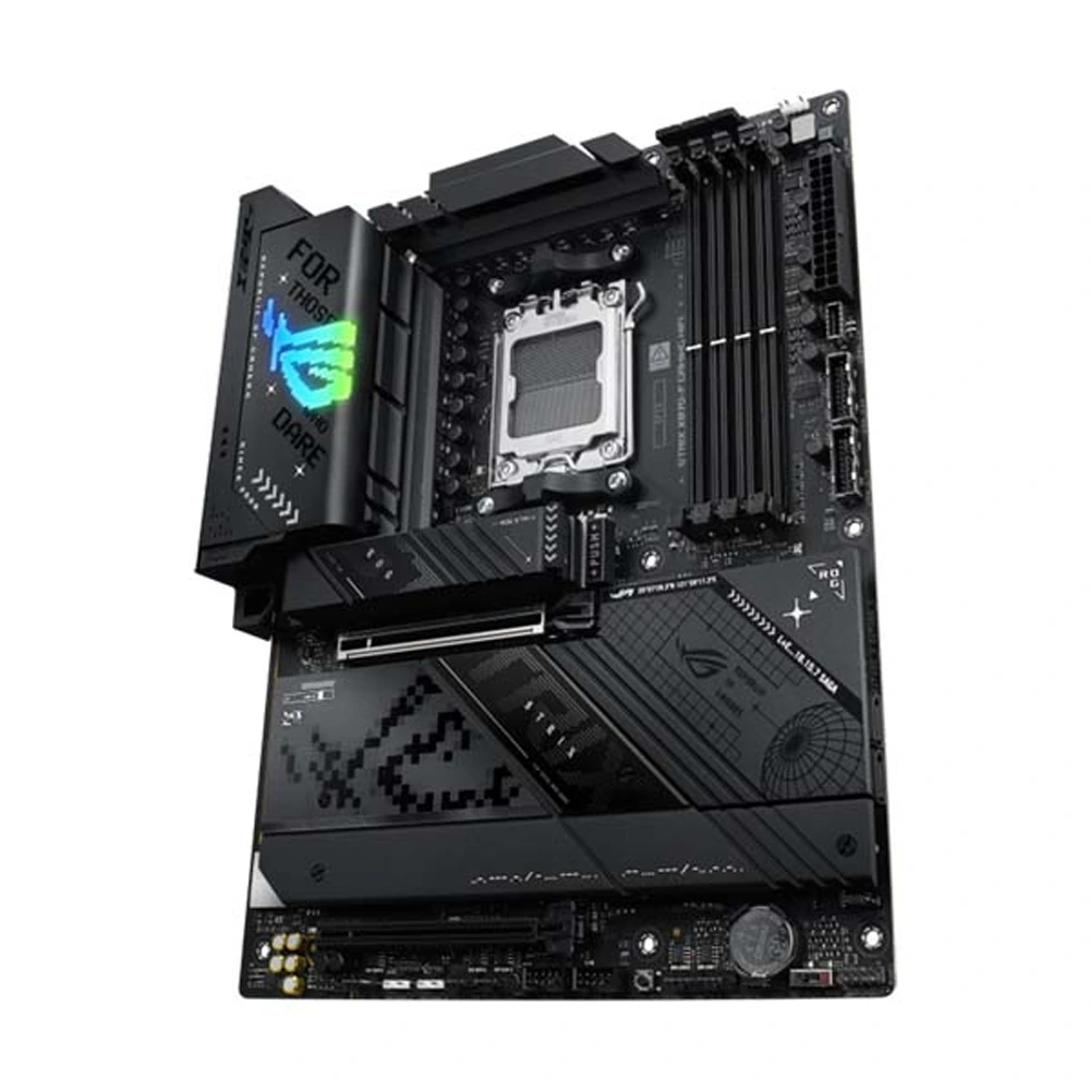 The ROG Strix X870-F is sleek and understated, empowering you to seamlessly combine it with a wide range of system components. Its deep black PCB and matching metallic heatsinks create a dark and intense look, while a touch of RGB lighting on the I/O shroud lets you either stay under the radar or make a bold statement.