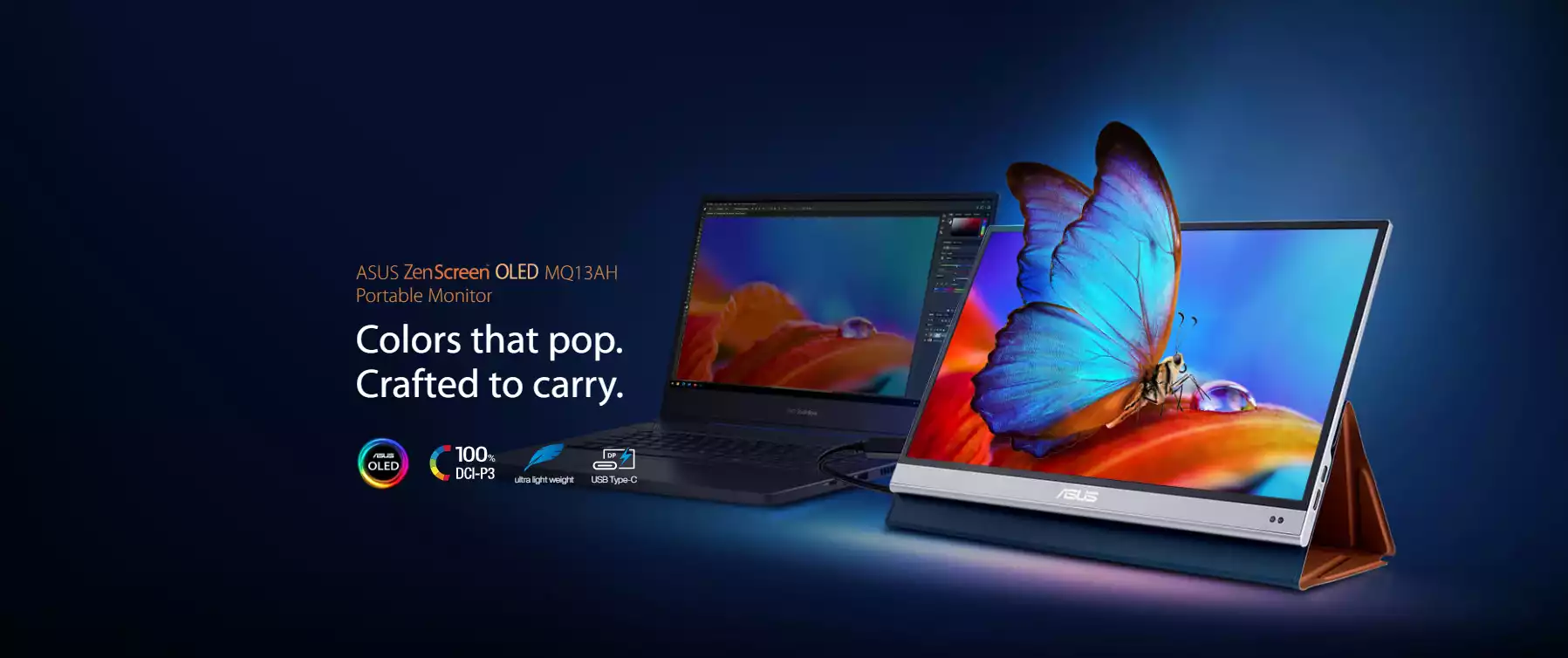 ASUS ZenScreen™ OLED MQ13AH is a 13.3-inch portable OLED monitor that delivers exceptional color performance, with a wide 100% DCI-P3 gamut and a 100,000:1 contrast ratio to ensure darker blacks and brighter whites. With a 1-millisecond response time, ZenScreen OLED MQ13AH displays blur-free animated and fast-action content. An ultralight, super-slim design and rich connectivity make this groundbreaking OLED portable monitor your perfect on-the-go companion.