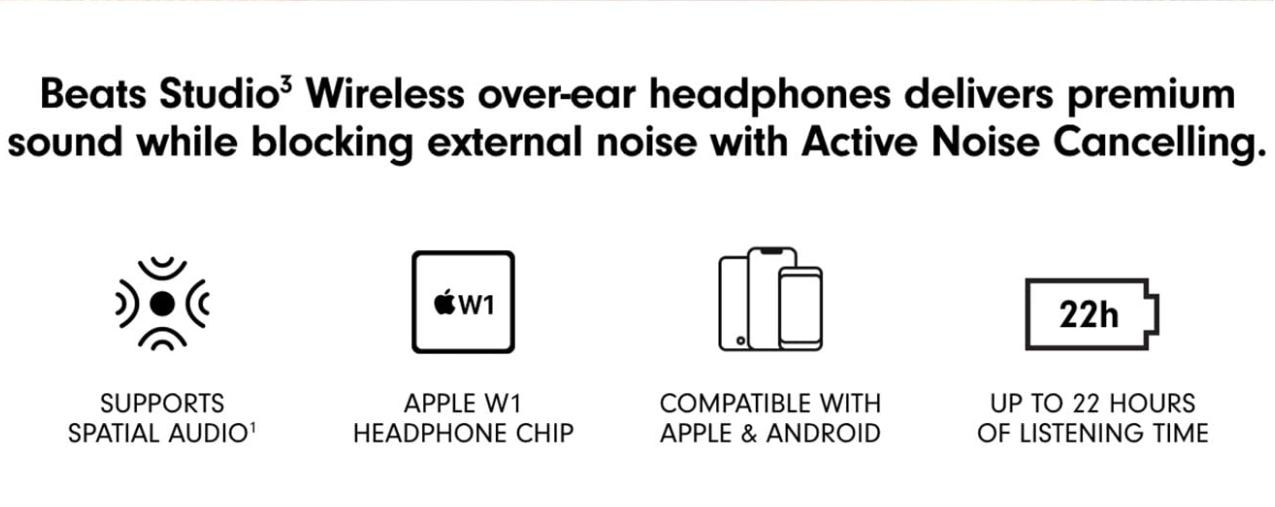 • What’s in the box: Beats Studio3 Wireless headphones, Carrying case, 3.5mm RemoteTalk cable, Universal USB charging cable, Quick Start Guide, Warranty Card (USB power adapter sold separately)