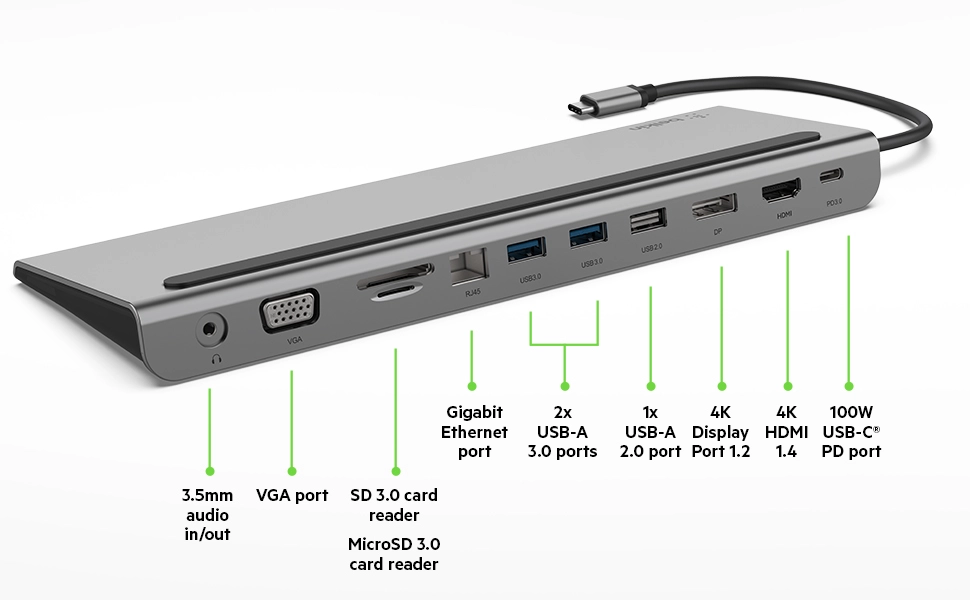 • Expands USB-C port into an HDMI port, DisplayPort, VGA port, 3 USB-A ports, Gigabit Ethernet port, SD and MicroSD card readers, 3.5mm audio port, and USB-C PD port