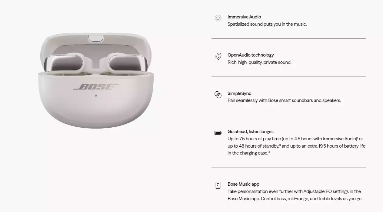 Bose Immersive Audio spatializes audio, creating the impression that the music you hear is being played in the room around you instead of through the earbuds you’re wearing.
