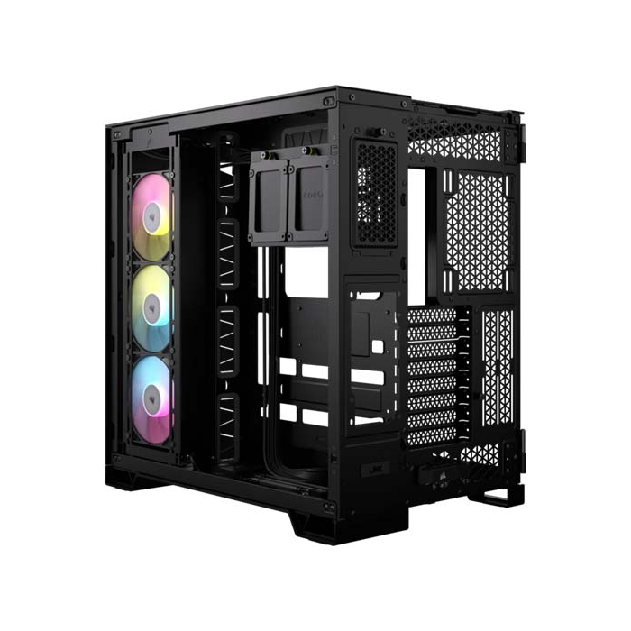 The CORSAIR iCUE LINK 6500X RGB Mid-Tower Dual Chamber PC Case organized view of your SFF PC through dual tempered glass panels, with three pre-installed RX120 RGB fans.
