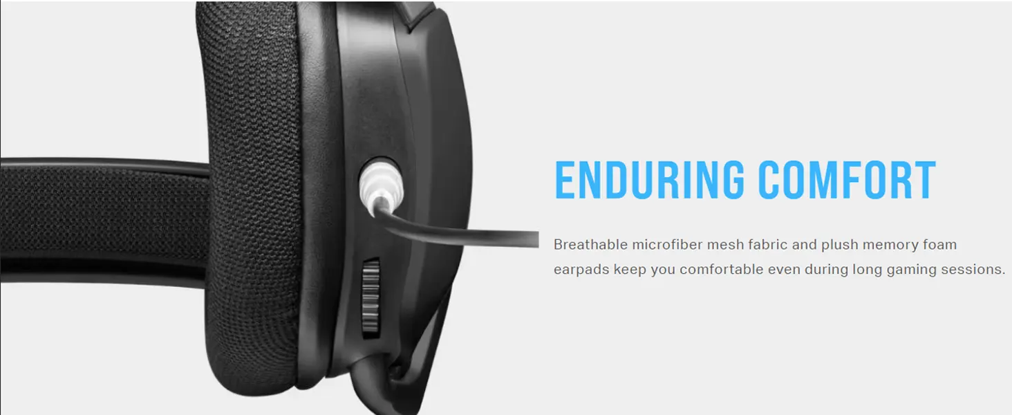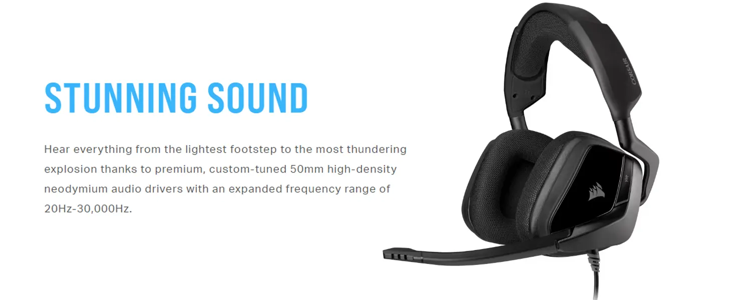 Hear all the action with the CORSAIR VOID ELITE STEREO, boasting custom-tuned 50mm neodymium audio drivers, comfortable microfiber mesh fabric with memory foam earpads, and an omnidirectional microphone.