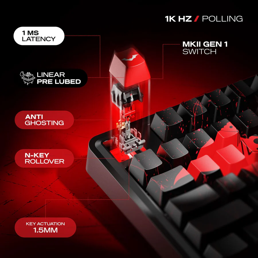 - Keycaps: Double-shot PBT (Batman edition dye-sub)