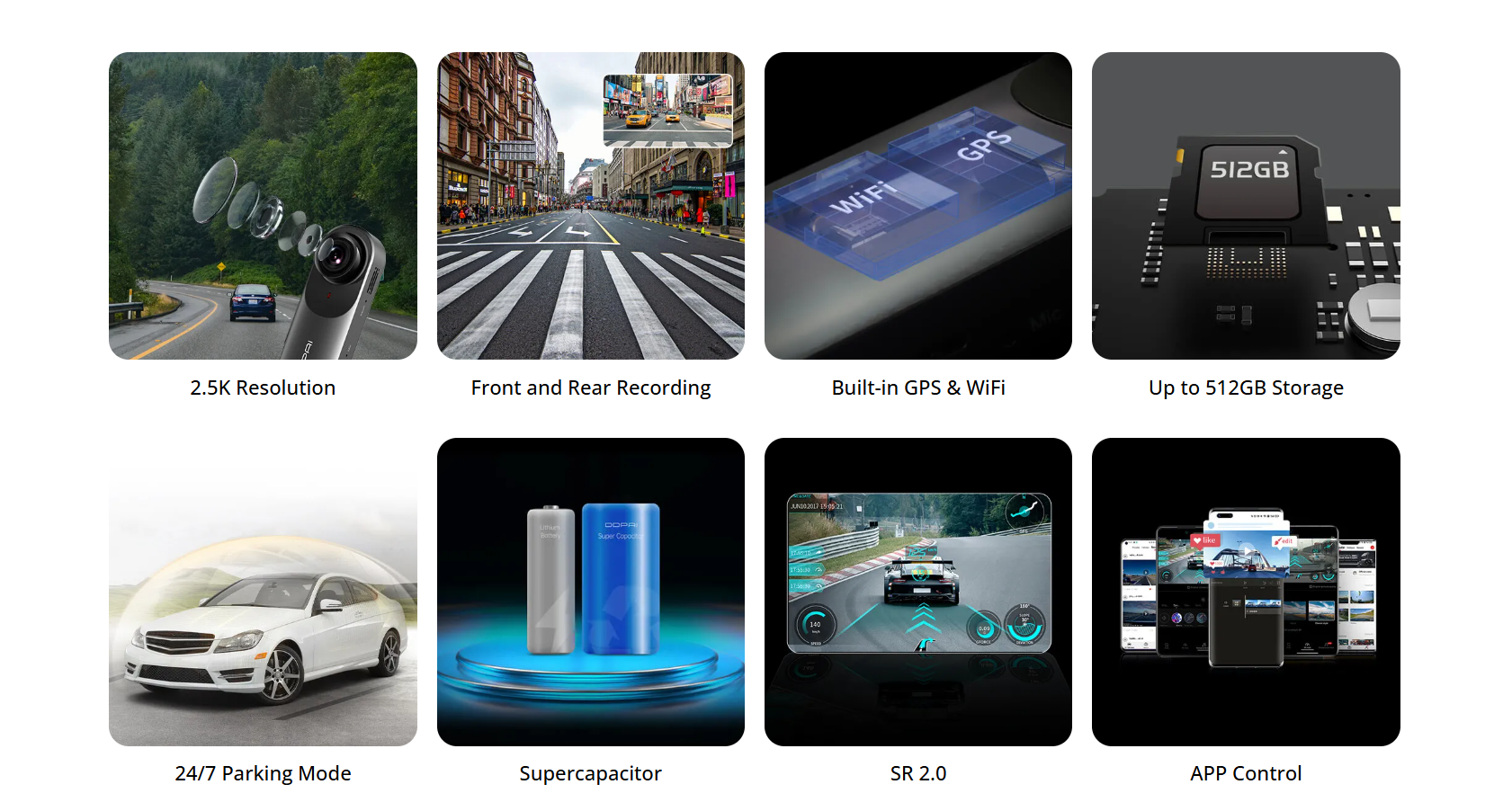 Powered by a supercapacitor, the dashcam could record securely even in survive extreme weather conditions from -20°C to 70°C. Unlike lithium-on dashcam, supercapacitor could prevent the risk of overheating and explosion, extend life span, also support last 3-4s recording even the dashcam is powered off.