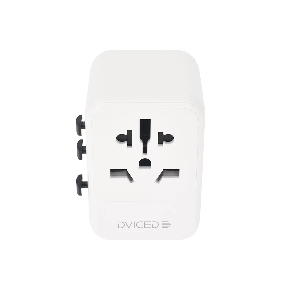The Dviced Universal Travel Adapter 28W GaN is a compact and efficient charger with plugs for UK, European, US, and Australian standards. Its elegant white design, quality materials, and GaN technology make it perfect for travel and everyday use.