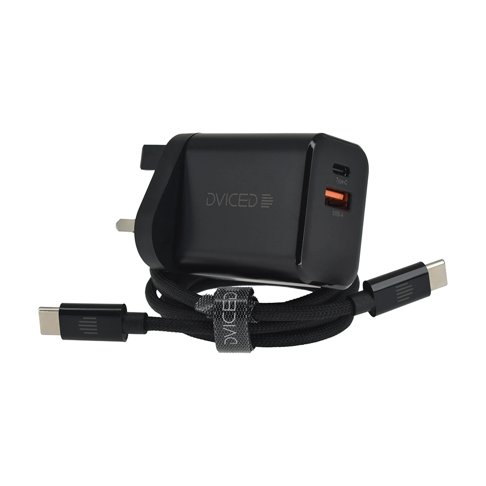 The Dviced Wall Charger 35W GaN is a compact, powerful charger with one USB-C and one USB-A port, allowing fast charging of two devices simultaneously. It includes a high-quality USB cable supporting 20V/5A, 100W max power, and 480 Mbps data transfer. With a UK standard plug, it’s perfect for the UK and similar regions.