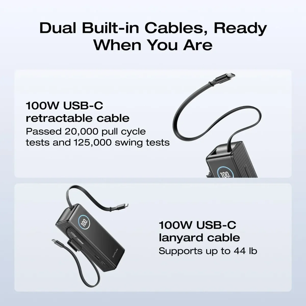 Multi-Device Power Bank: 2 × USB-C ports, 1 × 67cm retractable USB-C cable, 1 × 26cm lanyard USB-C cable