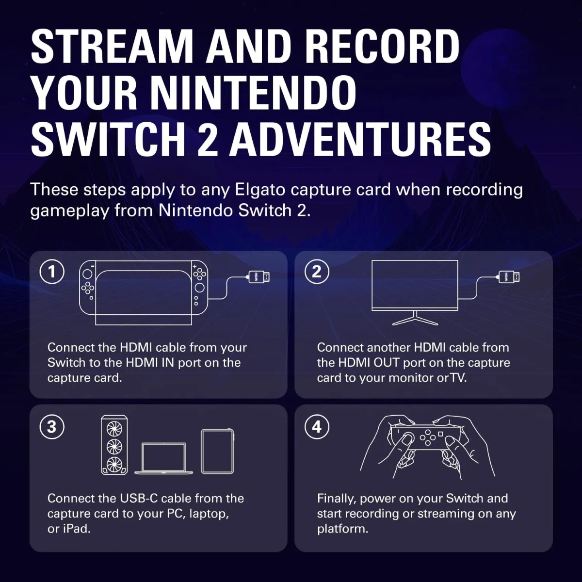 Elgato Game Capture 4K S lets you play and capture in 4K60, 1440p120, or 1080p240 with near-zero latency. Enjoy VRR passthrough, HDR10 capture (Windows only), and plug-and-play support across Mac and iPad too—a streamlined solution for high-performance capture on all your gaming systems. Technical Specifications: Input: HDMI 2.0 (unencrypted), 3.5 mm analog audio in Output: HDMI 2.0 (lag-free passthrough) Passthrough Resolutions: Up to 2160p60, 1440p120, 1080p240 Capture Resolutions: 2160p60, 1440p60, 1080p120, 1080p60, 720p60, 567p, 480p HDR10 Passthrough: Up to 2160p60 HDR10 Capture: Up to 1080p60 (Windows only) VRR Support: Yes Dimensions: 112 x 72 x 18 mm / 4.4 x 2.8 x 0.7 in Weight: 90 g / 3.2 oz System Requirements: OS: Windows 11 (64-bit), macOS 13 or later, iPadOS with USB-C CPU: Intel Core i5 (8th gen or later) / AMD Ryzen / Apple M1 or better GPU: NVIDIA GeForce RTX 10xx or equivalent Port: USB 3.0 Type-C Product Dimensions: Size: 17 x 112 x 72 mm (depth x width x height) Weight: 91 g / 0.2 lbs In The Box: Game Capture 4K S, USB C-to-C Cable (150 cm / 59 in.), HDMI 2.0 Cable (150 cm / 59 in.)