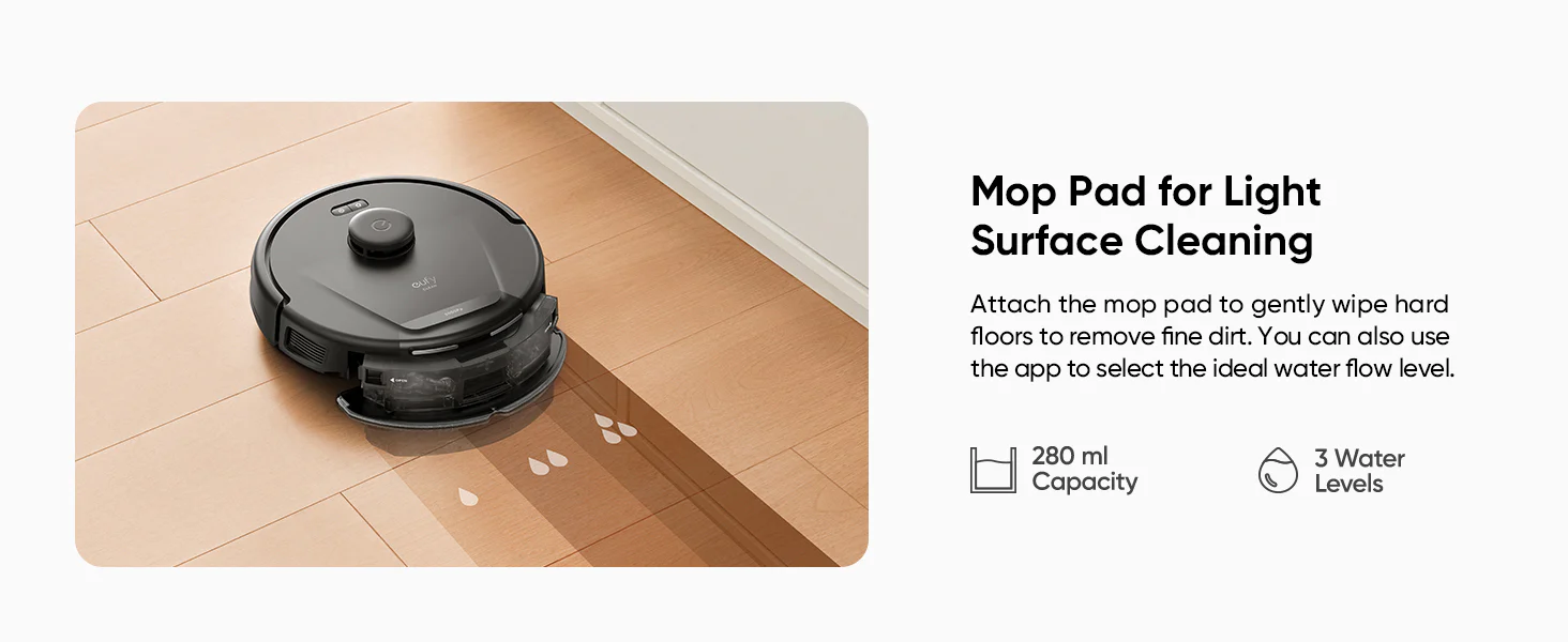 • Mop Pad for Light Surface Cleaning: Attach the mop pad to gently wipe hard floors to remove fine dirt. You can also use the app to select the ideal water flow level.
