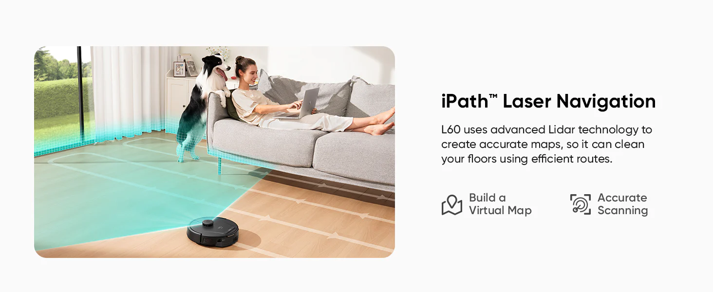 • Precision Mapping for Efficient Navigation: iPath Laser Navigation uses advanced Lidar technology to scan rooms and create accurate maps for efficient cleaning routes around your home.