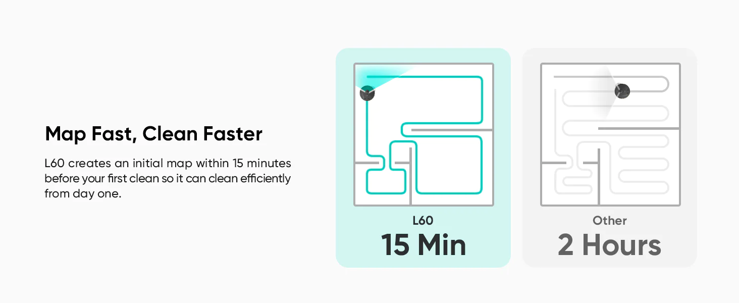• BoostIQ Technology: Different surfaces require different amounts of suction power for maximum cleaning efficiency, so L60 automatically increases suction when needed.