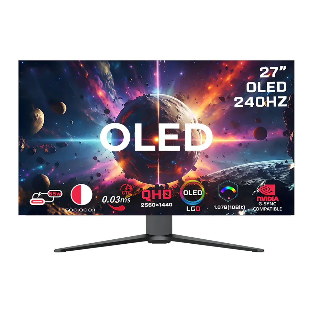 - 27″ Matte OLED Display: Flat 16:9 panel with self-emissive pixels delivering ultra-high contrast up to 1,500,000:1 at 25% APL.