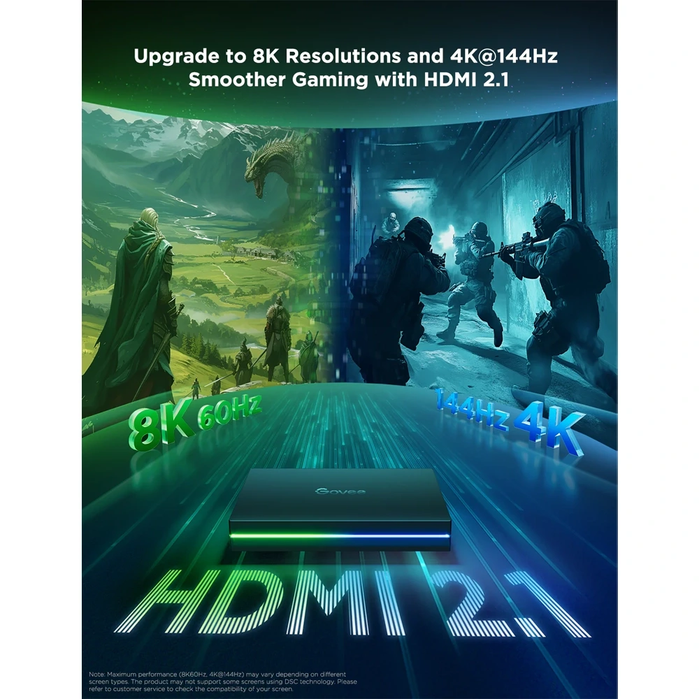 Immerse in Next-Gen Entertainment: Elevate your gaming setup with Govee AI Gaming & TV Sync Box , now equipped with HDMI 2.1 for seamless 8K visuals at 60Hz and 4K at 144Hz. Experience vibrant 4-in-1 RGBWIC lighting, AI-driven effects, and reduced lag with VRR and ALLM support. Upgrade to a new level of gaming and entertainment immersion today!