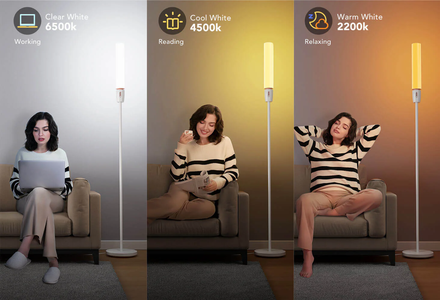 • Multidirectional Lighting: The smart floor lamp’s 360° lighting illuminates your home with 2200k-6500k warm/cool whites and 1500 lumens.