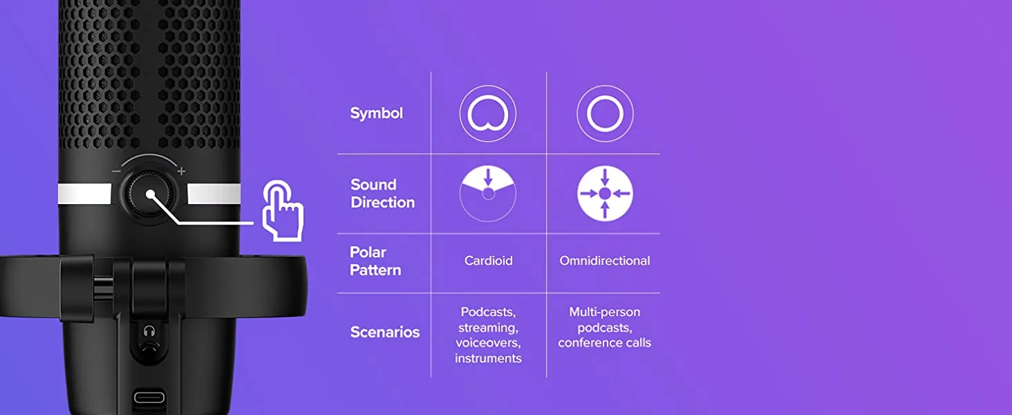 As referenced by its name, the DuoCast has two polar patterns: cardioid and omnidirectional. Switch between the two at the touch of a button.