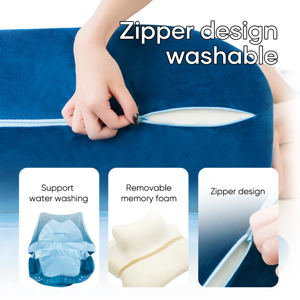The pillow cover has a zipper for easy removal. The memory foam core is removable, easy to clean, and durable.