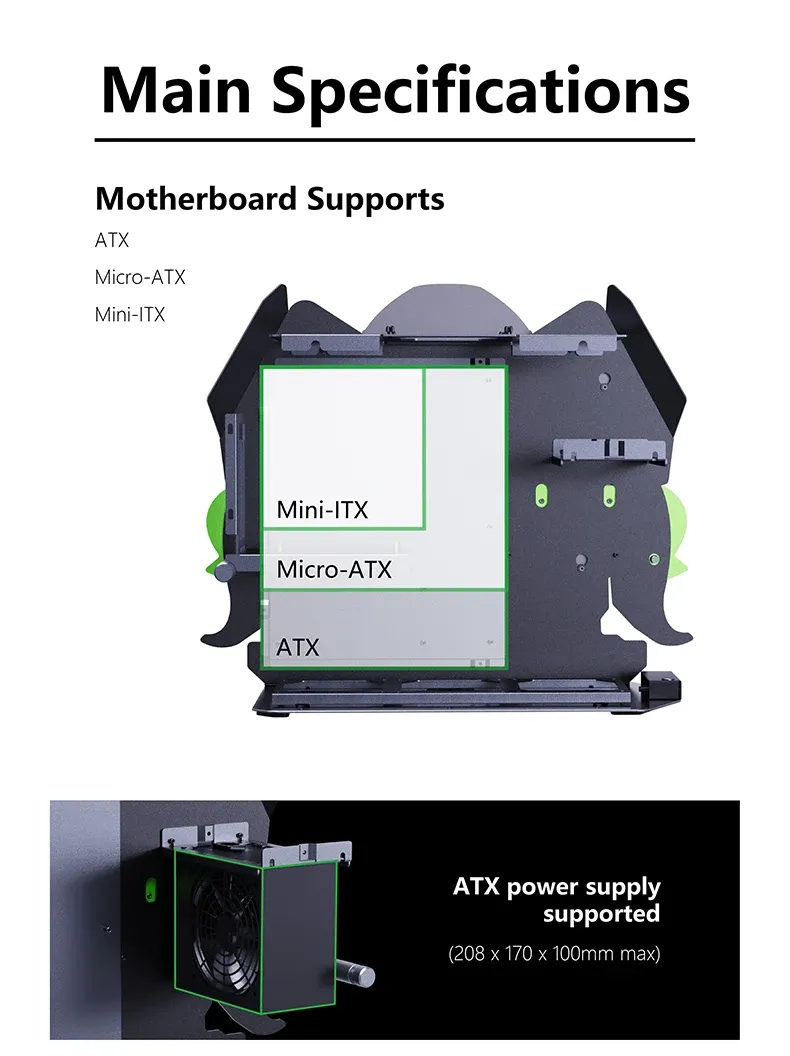 • PSU Compatibility: Fits power supplies up to 208mm (L) × 170mm (W) × 100mm (H)