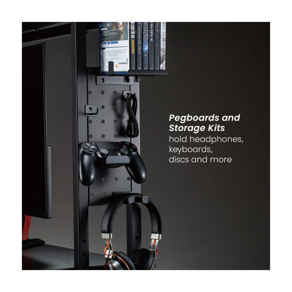STB-192 is the ideal solution for increasing desk storage space and expanding desk layout. The two-tiered shelves and pegboard with storage kits allow for the storage of game accessories as well as monitor arms or monitor stands. The shelves can be positioned forward and backward to keep the monitor at an ergonomic distance. There are also four height settings for the optimal viewing position. With the desk-mounted design, the shelf frees up more desktop space while causing no damage to the surface.