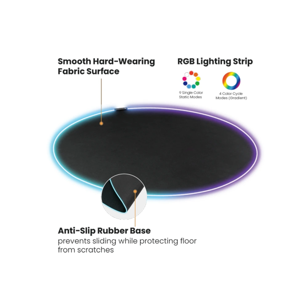 To complete the gaming setup, a gaming chair mat is an essential accessory. MP06-11 gaming chair mat is lightened by an RGB light strip to provide vibrant and compelling gaming vibes. The smooth hard-wearing fabric surface allows easy chair movement while protecting the floor. The anti-slip rubber base prevents sliding ensuring a stable experience. Anti-fray stitched edge is extremely durable in use.