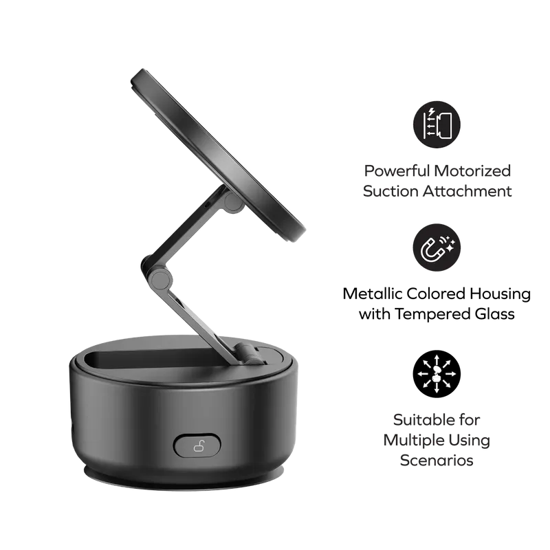 The 1-Snap Go boasts a foldable, compact design that effortlessly slips into your pocket, bag, or purse. Don’t let its small size fool you; this stand packs a punch with its powerful motorized suction attachment, securely gripping any flat, smooth surface with unwavering stability.
