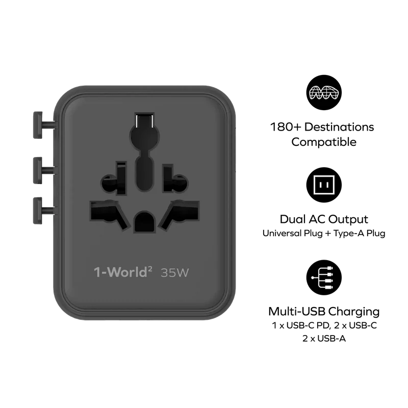 The 1-World² utilizes cutting-edge Gallium Nitride (GaN) technology to deliver an impressive 35W of power in an incredibly compact form factor.