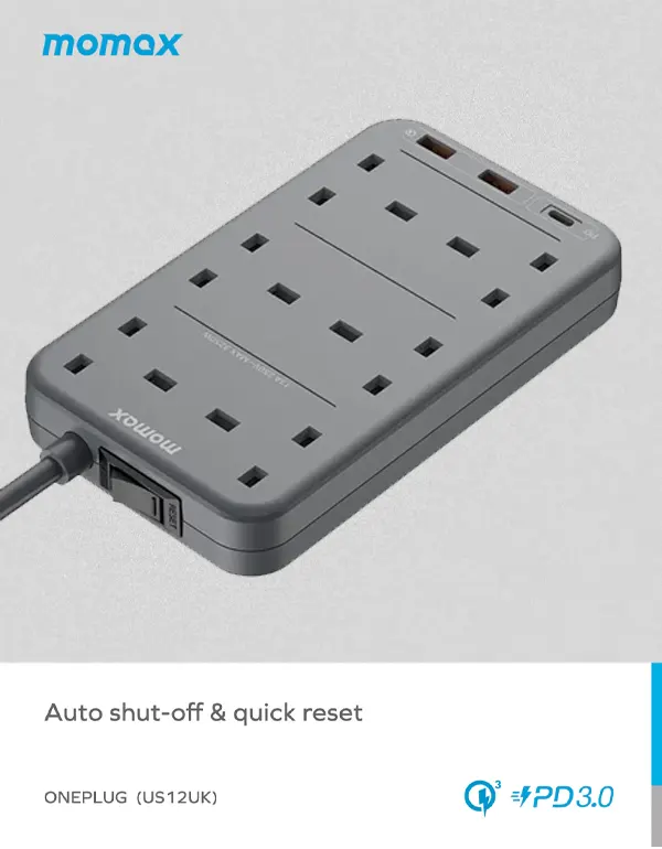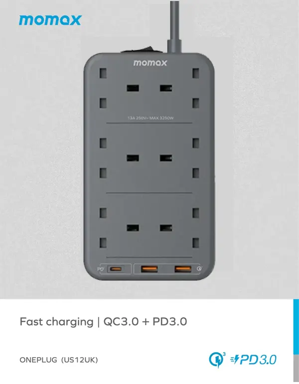 US12UK is a 6-outlet power strip with 2 QC 3.0 USB ports and 1 PD3.0 USB-C port.  It provides high speed charging performance and enable fast charging for your devices. The dual-rows design can help you save space at your home.  It can offer stable and fast power output for up to 9 devices at the same time.