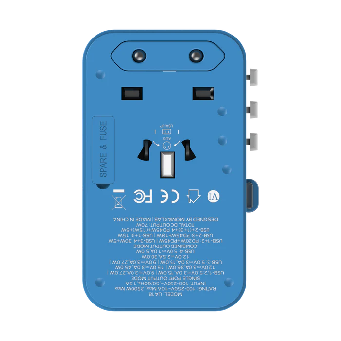 Momax World+ 3-ports Travel Charger Built-in Usb-c Cable (Gan 70w) – Blue