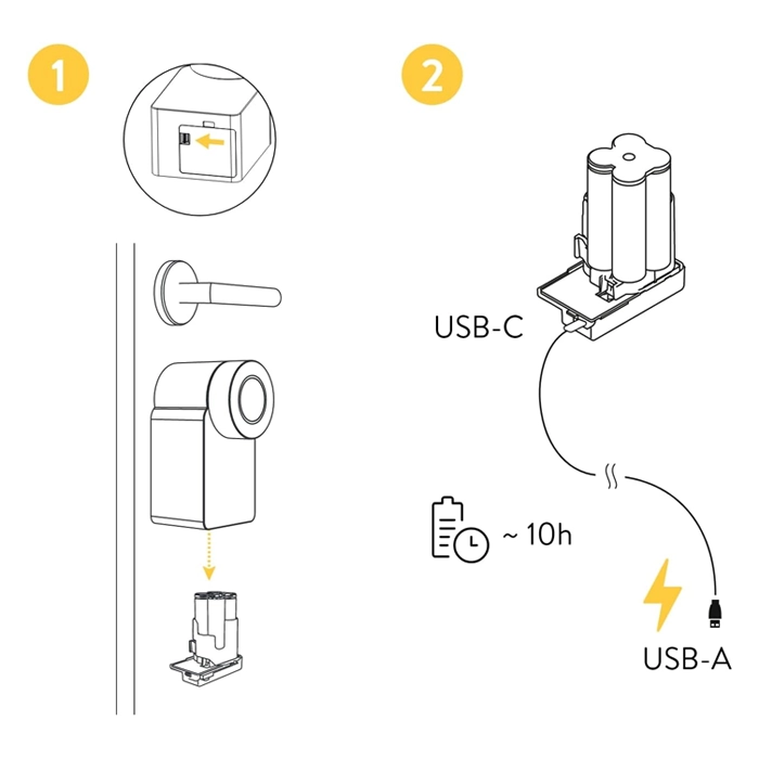 With the rechargeable battery pack there is no need to change the battery anymore. The Nuki Power Pack is charged via USB-C cable. Included in the delivery is a standard USB-C charging cable (50 cm, USB-A to USB-C). Charging can be done while using your door, thus enabling a permanent power supply for your Nuki Smart Lock.