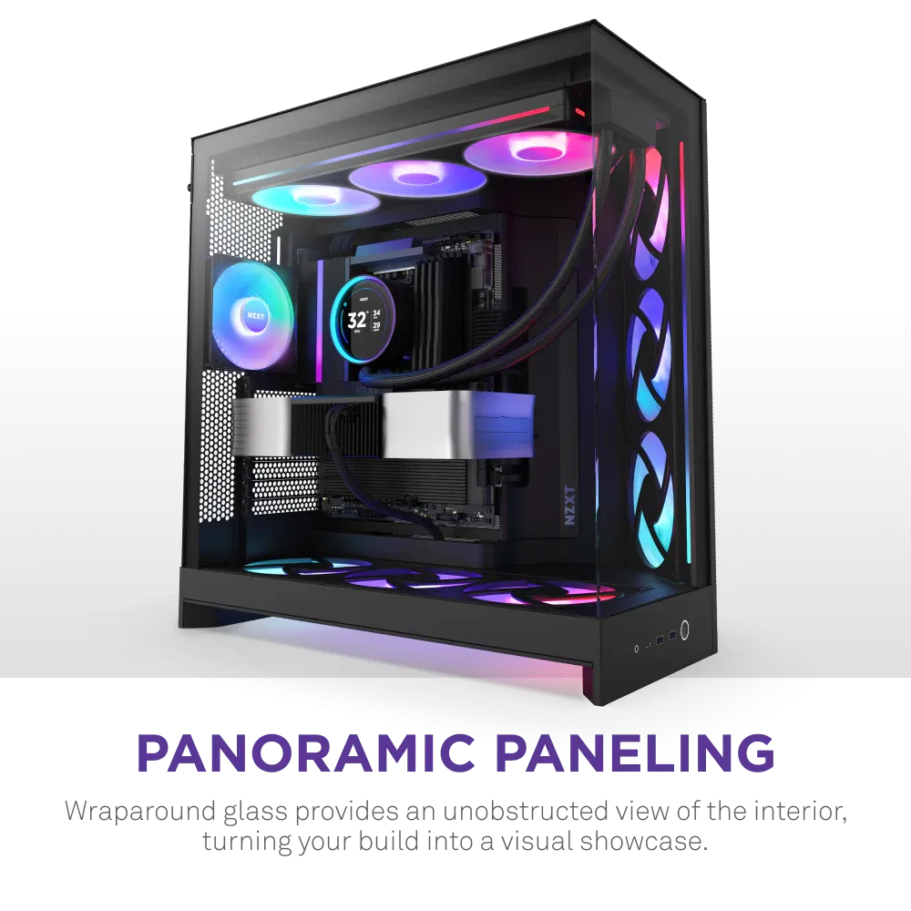 • Panoramic View: Showcase every detail of your build with seamless, wraparound tempered glass paneling.