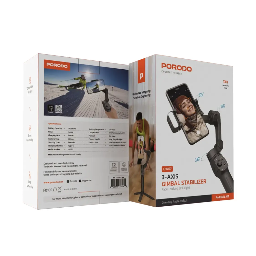The Porodo 3-Axis Gimbal Stabilizer aims to take videography to the next level with smooth stabilization and intelligent tracking. 3600mAh, impressive working time of 780 minutes, and 1560 minutes of standby time make for a longer content creation experience. Fit for smartphones of up to 7.2 inches in dimension, the stabilization has a payload support capacity of 150-280g, which makes it great for maximizing versatility on different devices. It also comes with a detachable magnetic fill light for low-light recording, smart live tracking that keeps subjects perfectly framed, and Type-C fast charging, making it compact, foldable, and longer battery life- perfect for travel vloggers and creators.