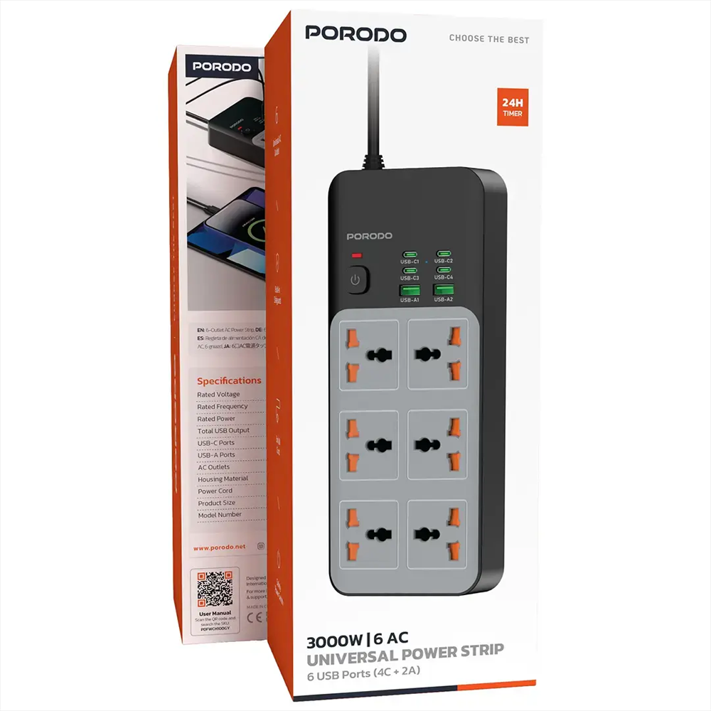 Porodo 3000W 6AC Universal Power Strip with 6 USB Ports (4C + 2A) in Gray is an ideal power solution for both home and office. It has 6 universal AC outlets and enables various devices to connect without considering plug types. The six USB ports—four USB-C and two USB-A—guarantee fast and efficient power supply with a total USB output of 5V/4.1A. Besides, it allows the simultaneous powering and charging of devices as it comes with a 24-hour timer to help save energy and make the usage more convenient. It is also safe as it is made of flame-retardant PC housing and thus offers durability and safety. The 3-meter UK cord allows for placement flexibility, whereas the safety power switch along with the built-in safeguards ensures that there will be no instances of overcharging and short circuits. It is a power strip that has performance, safety, and convenience all in one and thus one cannot overlook its necessity in a work or living area.