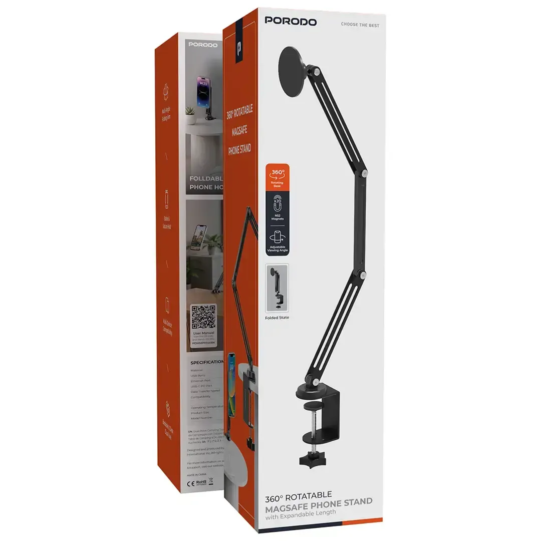 The black Porodo Foldable 360° Rotatable MagSafe Phone Stand with Expandable Length is a combination of flexibility and accuracy that gives users the chance to adjust the angle easily for the best viewing experience. The rotating design makes this stand able to effortlessly position any devices at all angles, thus making it the best support not only for work but also for leisure time. The integrated MagSafe phone mount keeps your smartphone secure while the stand guarantees a firm and safe grip. Its foldable structure makes it easy to store and carry, and its wide compatibility with smartphones (4″-7″) adds to its versatility. Whether it is on your desk or nightstand, the MagSafe Phone Stand always provides ergonomic and flexible comfort. It is the best for hands-free viewing, video calls, or media watching; it gives maximum convenience and comes with an elegant design to upgrade your setup.
