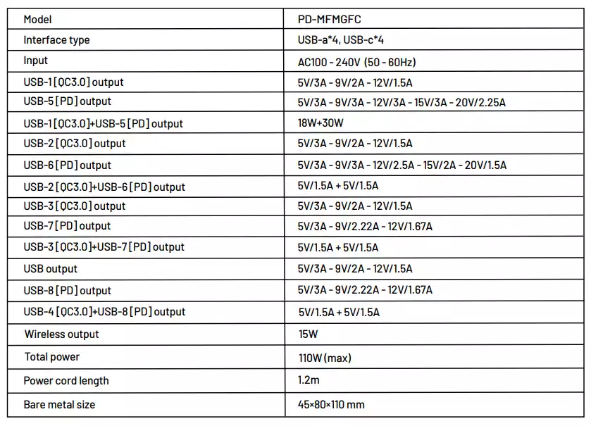2. For individual port specifications: each QC 3.0 port can output 18W, and the PD port can output a maximum of 45W for USB 5 ,30W for USB 6 ,20W for USB 7, and 20W for USB 8.