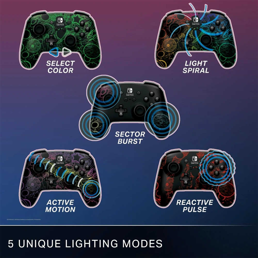 RGB LED lighting reveals a hidden stunning galaxy design on the top of the controller when activated and has five unique lighting modes bringing stars and planets to life. Modes: Color Select, Light Spiral, Sector Burst, Active Motion, Reactive Pulse.